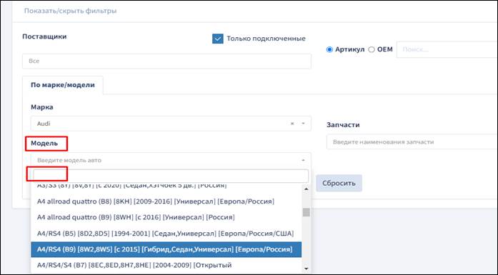 Кликните на поле поиска «Марка», введите марку автомобиля или выберите из списка. В поле «Модель», введите модель автомобиля или выберите из списка.