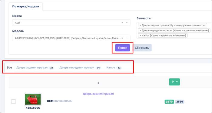 Кликните по полю поиска «Запчасти», введите наименование запчасти или выберите из списка. Вводить можно даже сокращенно, например, «двер пер прав» или «двер лев». Программа поймет вас и покажет варианты запчастей. Кликните на предложенное наименование запчасти, она добавится в поле поиска.